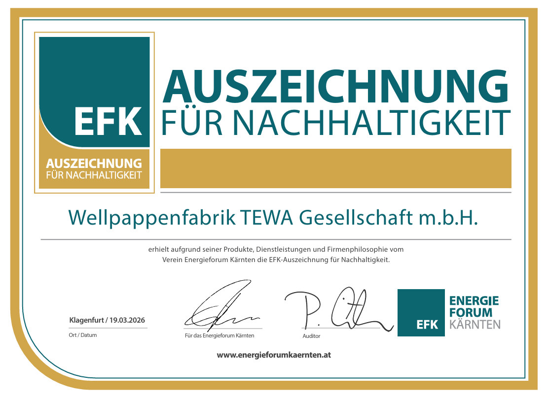 Die Wellpappenfabrik TEWA GmbH wurde vom Energieforum Kärnten für ihre nachhaltigen Produkte, Dienstleistungen und Firmenphilosophie erneut ausgezeichnet.